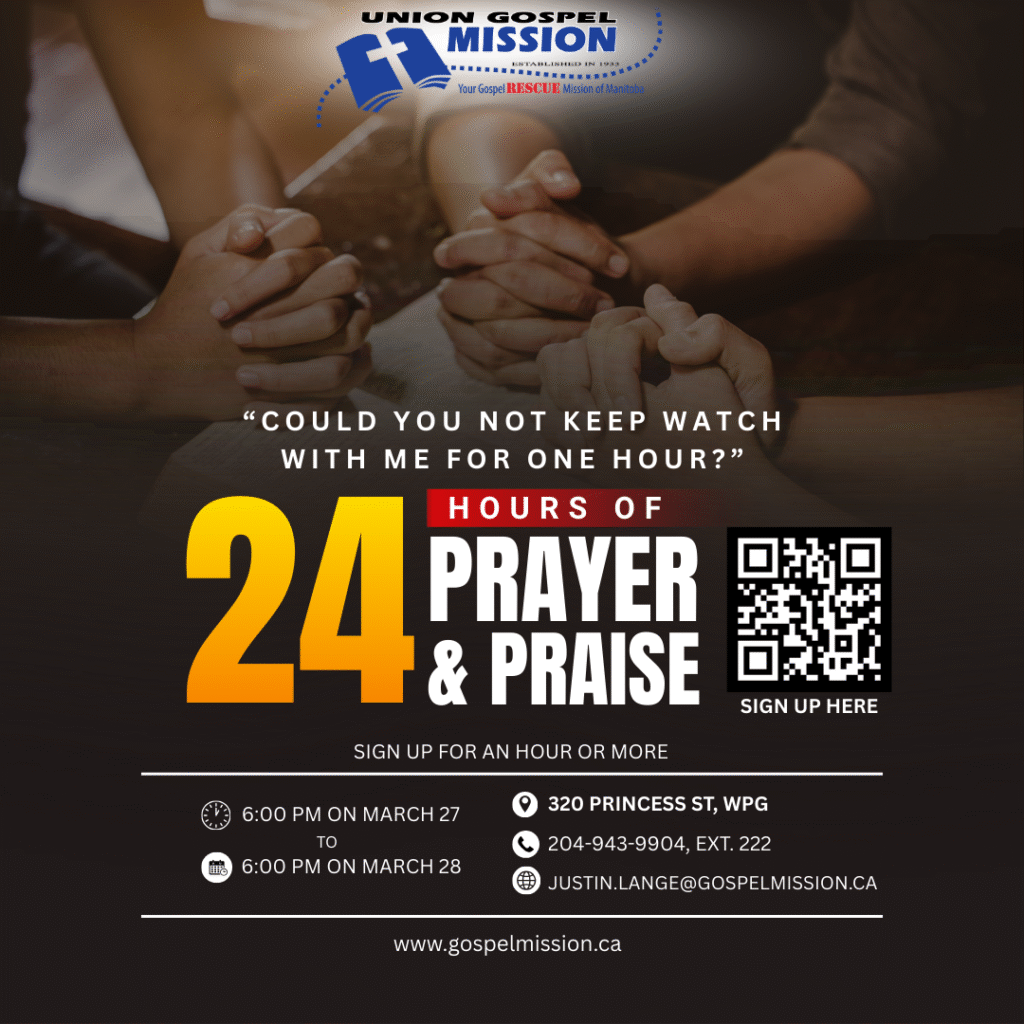 Join us as we pray and praise God for 24 hours straight for our community, city, and country. We would love it if you joined us for even one hour and interceded for all those in our community who are struggling, sick, and who need to know the only Giver of life and salvation. This event runs from March 27 at 6 PM to March 28 at 6 PM! We will also be reading Scripture throughout the event. If you wish to sign up for this event, scan the QR code, or contact Justin at 204-943-9904, ext. 222 orĀ justin.lange@gospelmission.ca. We would love to pray with you and enter the throne room of our God and Father together on behalf of all those in our lives. #prayer #24hours #praise #keepwatch #nobodybutjesus