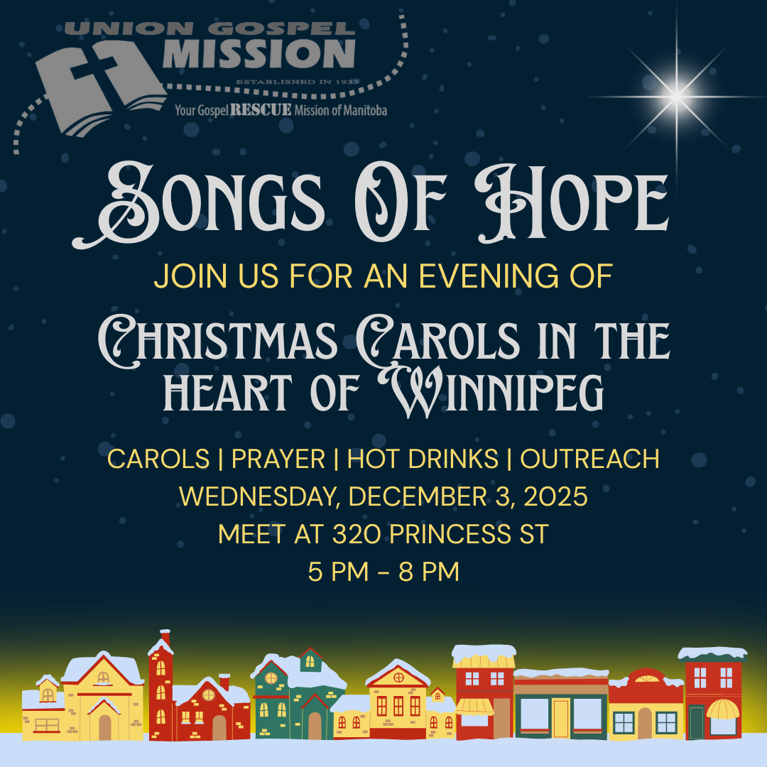 DID YOU KNOW? It’s UGM’s 2nd annual Songs of Hope event this Wednesday, Dec. 3 at 5 pm. We will be carolling in the North End of Winnipeg, walking the streets and singing about the hope found only in Jesus, who came to save the world from their sin and from death. We will also be handing out hot chocolate, blankets, and food to those in the community and those on the cold streets of Winnipeg. Consider joining us as we share the love of the Saviour with our community. If you plan to come, please RSVP to Munya at volunteer@gospelmission.ca or by calling 204-943-9904, ext. 224 (The time in the Voices has changed; this event now runs from 5 – 8 pm).