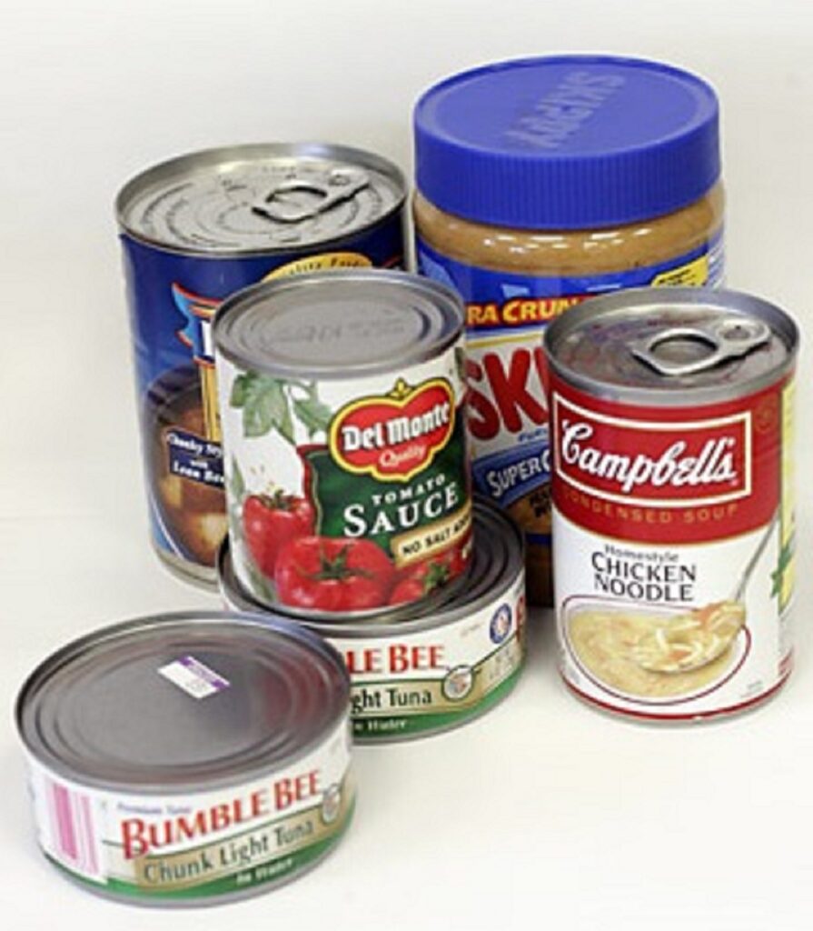 The canned items can include vegetables, fruit, meat, soup, beans, sauce, etc.