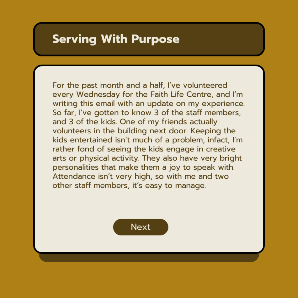 Another glimpse to further the volunteer’s experience serving in Family Life Centre’s Kid’s Club.